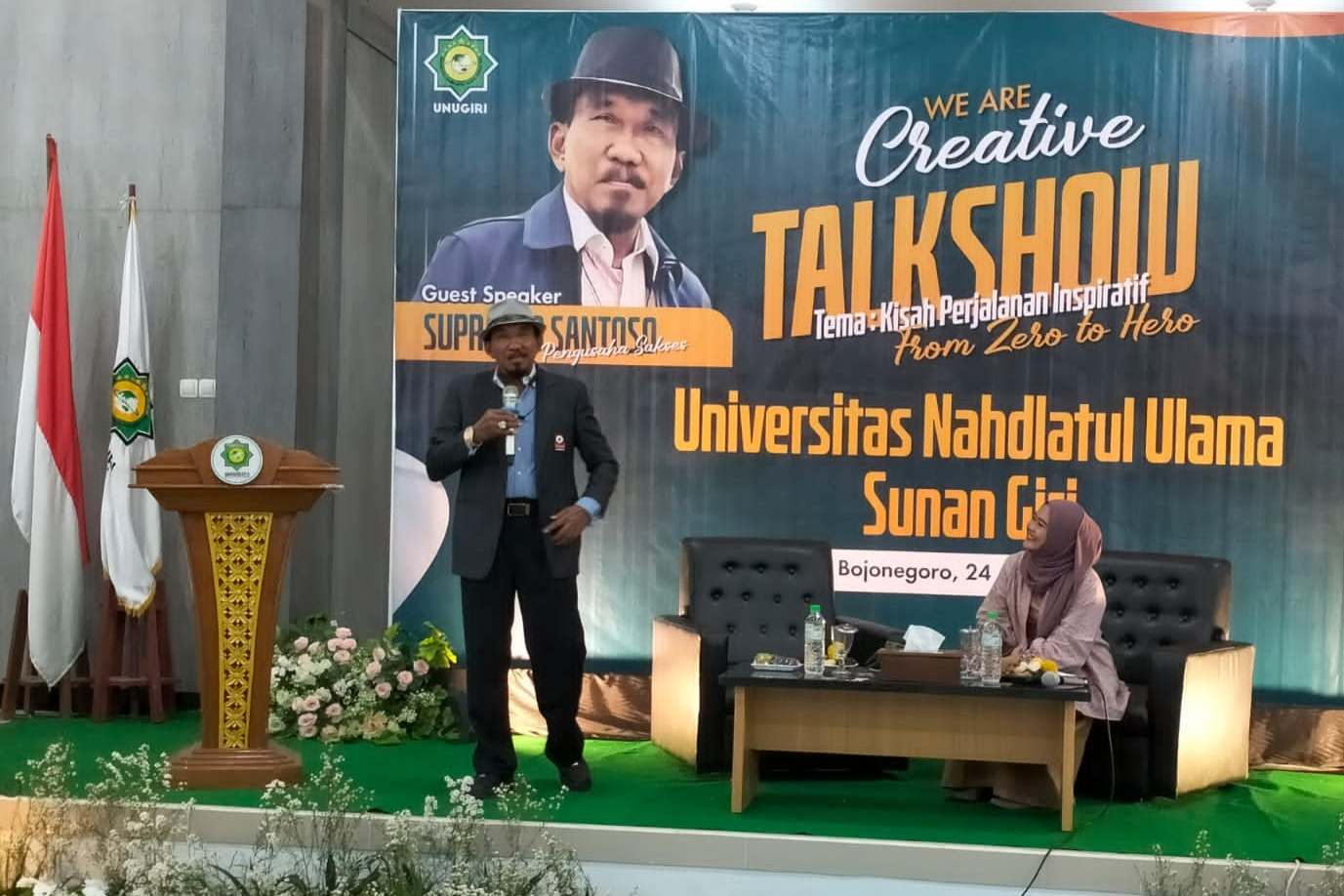 Bojonegoro – Jadi Pembicara dalam acara Talk Show yang digelar oleh Universitas Nahdhatul Ulama Sunan Giri (Unugiri) Kabupaten Bojonegoro, HM Suprapto Santoso menceritakan tentang perjalanan karier kehidupannya dihadapan Pengurus Unugiri, Rektor, Dosen, Tamu Undangan dan ratusan Mahasiswa, Sabtu (24/06/2023).
