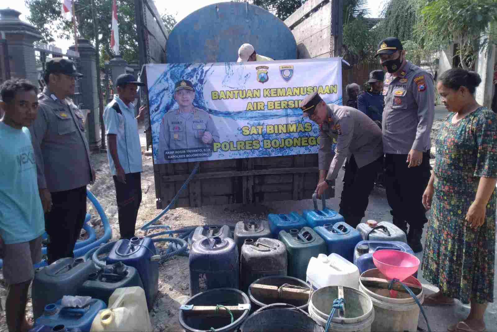Kapolres Bojonegoro, AKBP Rogib Triyanto, SIK melalui Kasat Binmas, AKP Agus Elfauzi mengatakan penyaluran bantuan 1 truk tangki berisi 5000 liter air bersih ini disalurkan bagi warga masyarakat yang mengalami kekeringan dan krisis air bersih tepatnya di Desa Duwel Kecamatan Kedungadem.
