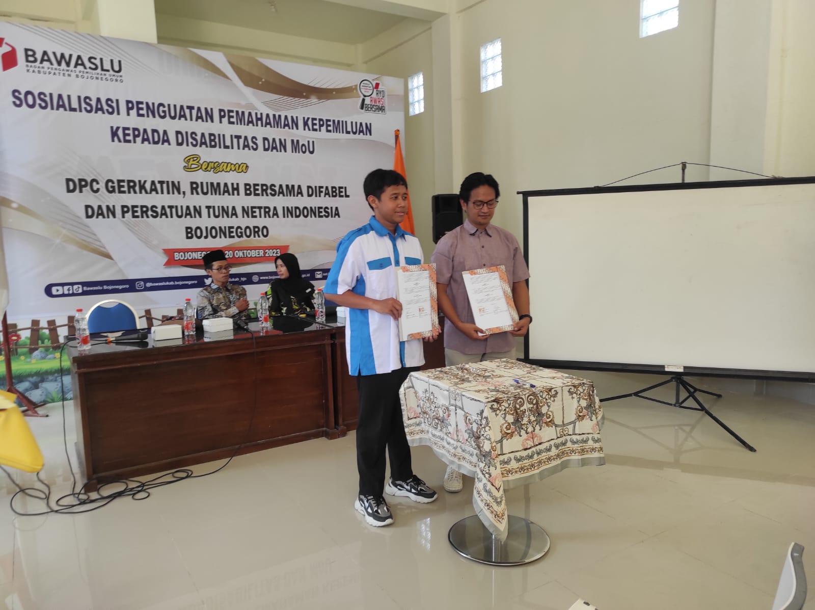 Selain sosialisasi juga dilakukan MoU antara Bawaslu dengan DPC Gerkatin, Rumah Bersama Difabel dan Persatuan tuna netra Indonesia Bojonegoro.