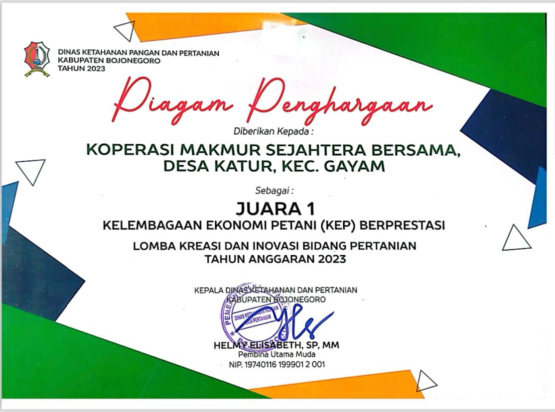 BOJONEGORO – Kiprah KPA Desa Katur dalam memberdayakan petani di Kecamatan Gayam, Kabupaten Bojonegoro menorehkan penghargaan prestisius. KPA Makmur Sejahtera Bersama itu merebut juara 1 Kelembagaan Ekonomi Petani Berprestasi dari Dinas Ketahanan Pangan dan Pertanian Kabupaten Bojonegoro.